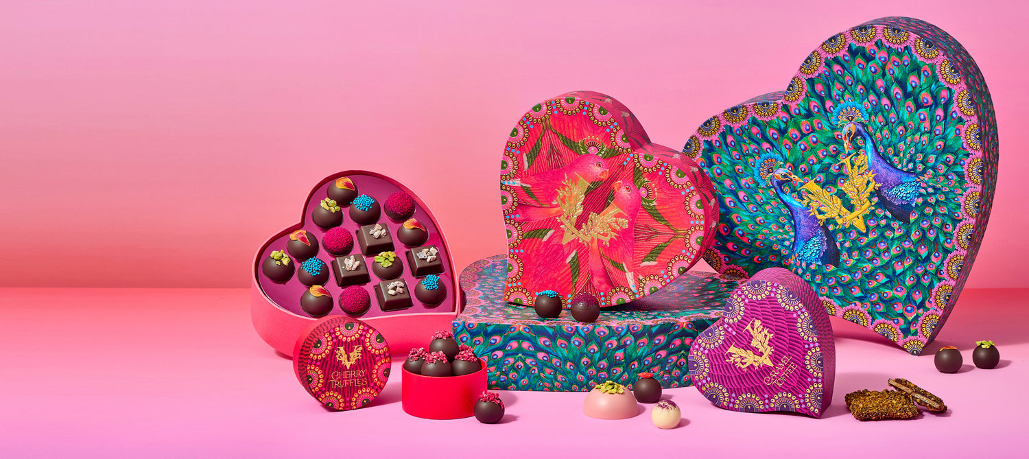 A kaleidoscope of parfums inspired by the vibrant beauty of the peacock. Each truffle celebrates nature's boundless artistry, weaving together sweet and earthy Japanese ube, nutty and rich Sicilian pistachio, lush pomegranate, hand-cut gianduia layers, and the delicate allure of Bourbon Island vanilla and blood orange caramel marshmallows.