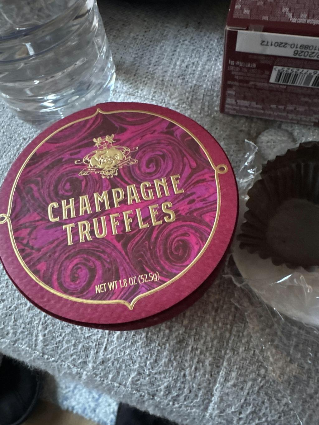 • A Vosges Ambrosia truffle and Wink of the Rabbit truffle adorned in gold leaf and a mexican pecan sit side by side in-front a small purple candy box tied with a purple ribbon bow on a grey background.