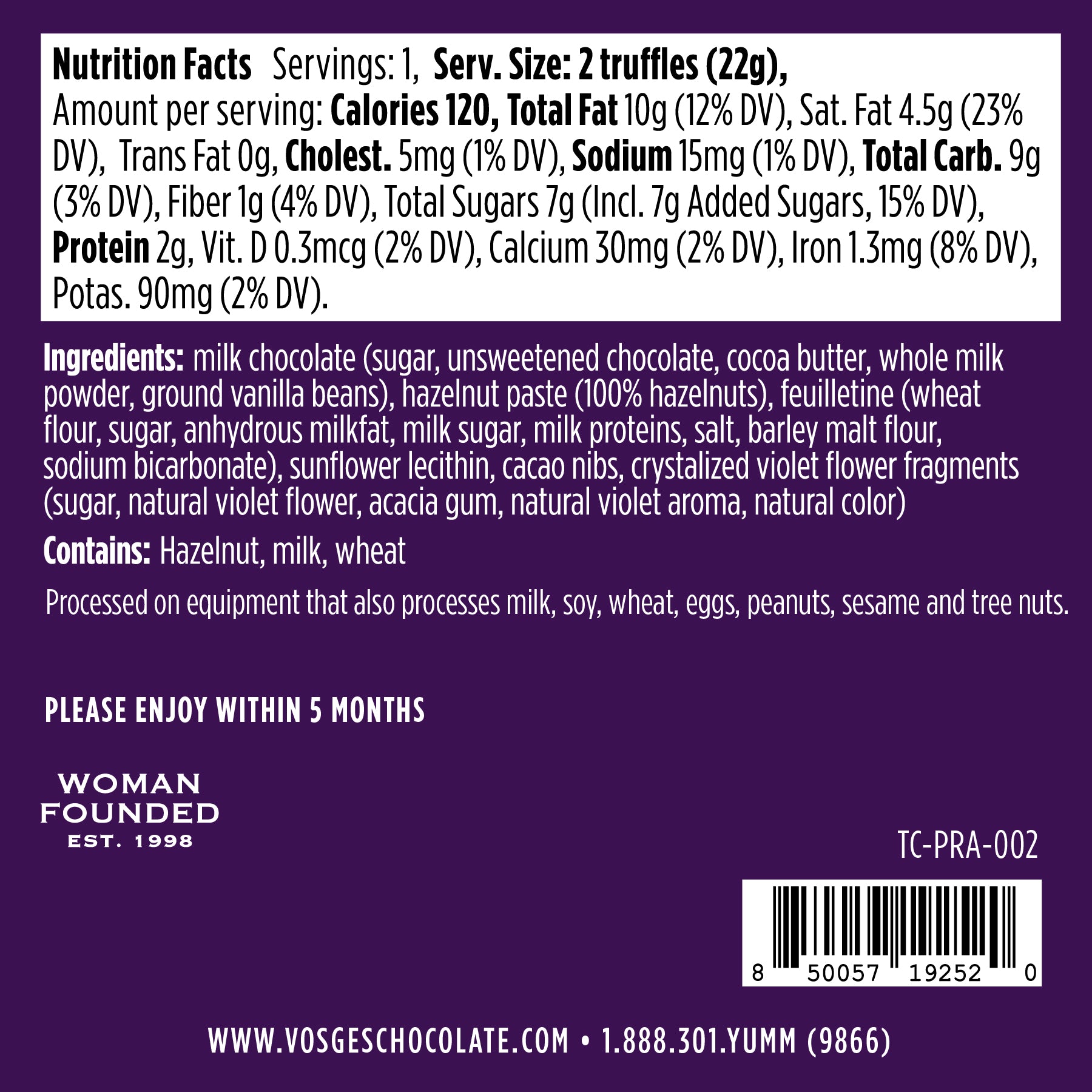I.G.P. Piemonte hazelnuts + feuilletine + 45% cacao deep milk chocolate + crystallized violet flower (*This truffle directly contains gluten.)