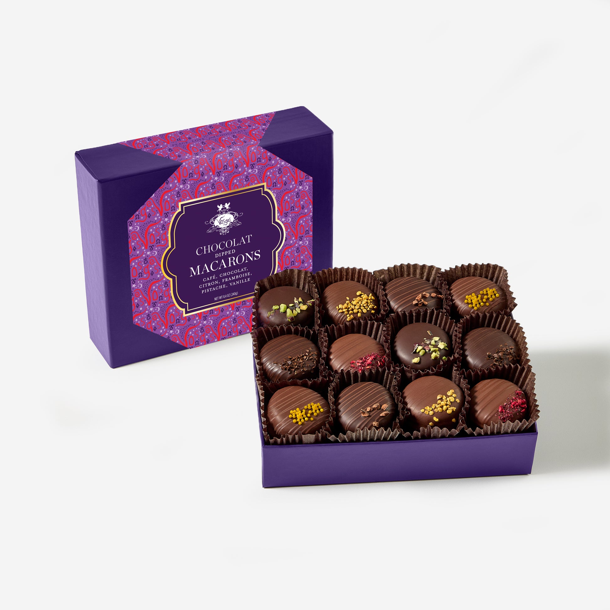 We elevate this classic by enrobing each macaron in deep milk and dark chocolate and crown them with sensorial toppings designed to be savored slowly.