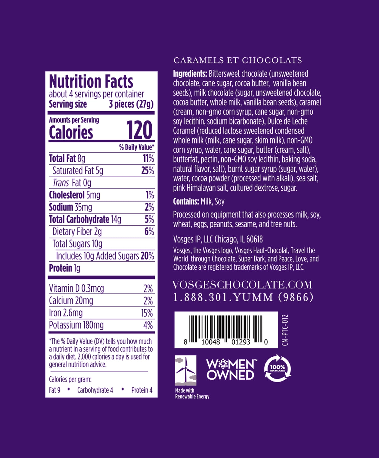 Proprietary Chocolate BlendOur proprietary chocolate is crafted specifically to support the ingredients we infuse with it to achieve a taste experience matching the storytelling. Our 62% cacao dark chocolate is one of our most intense and has a deep roasted vegetation, dried fruit and a touch of tart berry notes. Our 45% cacao deep milk chocolate is a roasted cacao with a dense caramel profile that is achieved through the caramelization of roller dried, whole milk during the conching process. At the heart of our mission is creating luxury chocolate collections with responsibility to the environment that sustains our earth. We have been sourcing Fair Trade or Rainforest Alliance certified cacao for over 15 years. We are powered by 100% renewable energy and abide by a green purchasing of procuring only post-consumer recycled board and biodegradable materials. Our kitchen exclusively uses Organic cream and sugar.