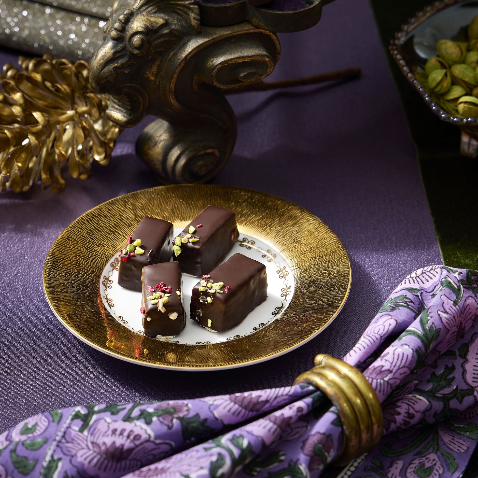 A festive blend of cranberries, roasted almonds, pistachios, and honey wrapped in dark chocolate.