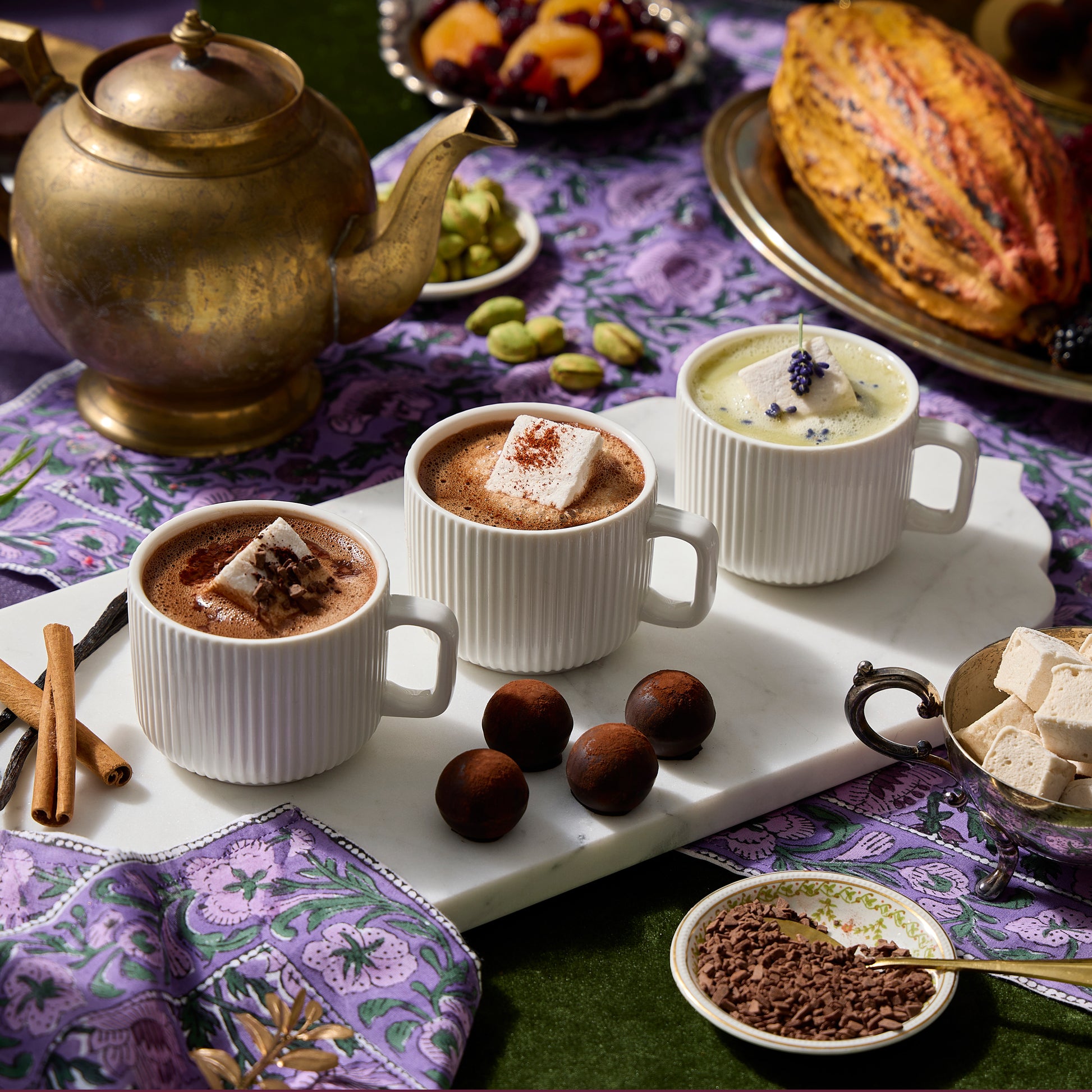 Indulge in the ultimate holiday chocolate experience with this luxurious trio of artisanal hot chocolates. Savor La Parisienne, a deep dark chocolate with Madagascar vanilla; Aztec, spiced with Ceylon cinnamon, ancho and chipotle chilies; and Bianca, a soothing white chocolate with lavender and lemon verbena. Each blend offers a rich, transportive sip of warmth and wonder. Perfect for holiday gifting, fireside indulgence, or creating café-style drinking chocolate at home.