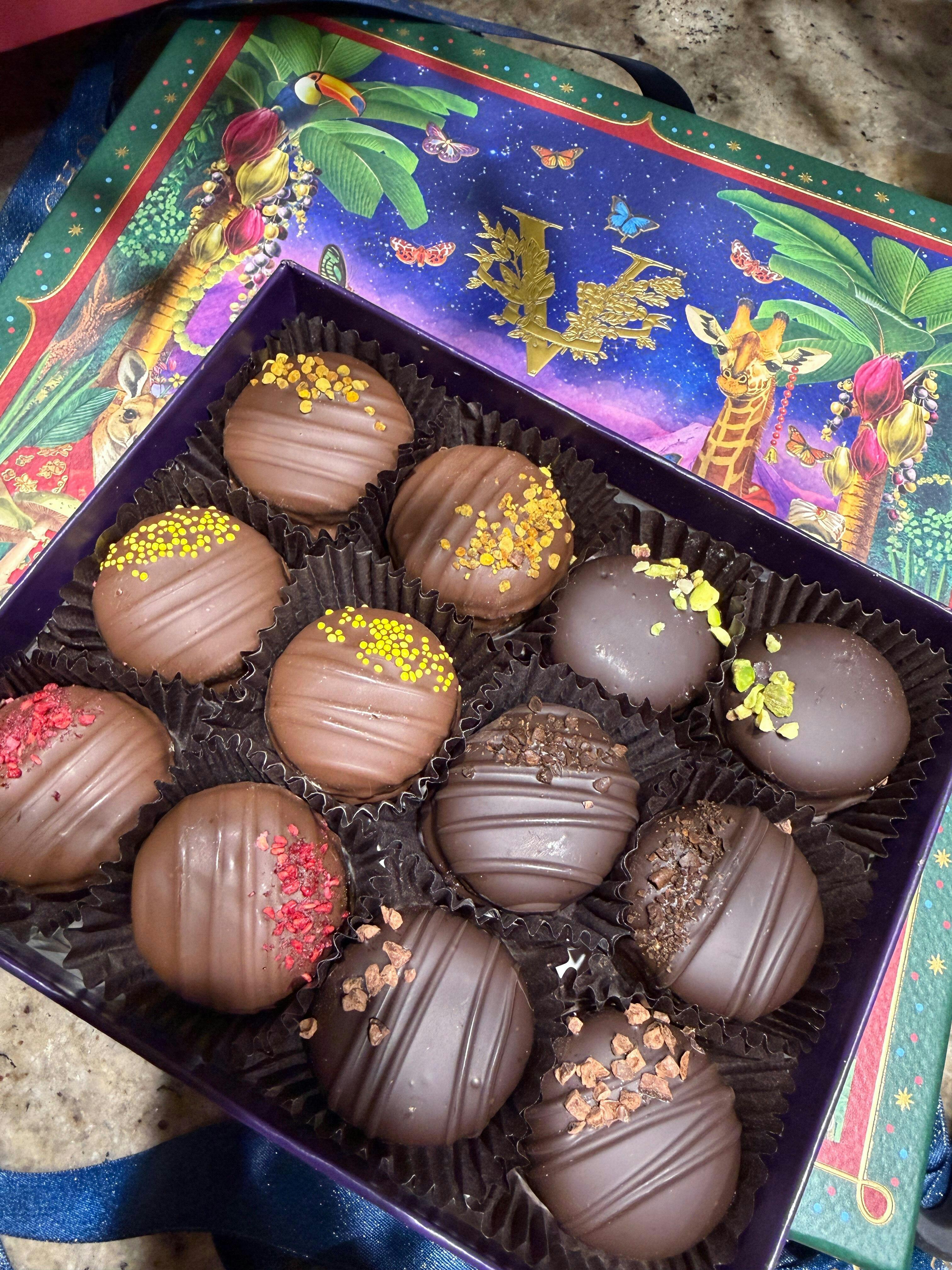 A French classic reborn—almond meringue macarons dipped in milk and dark chocolate, finished with pistachios, coffee beans, and bee pollen.