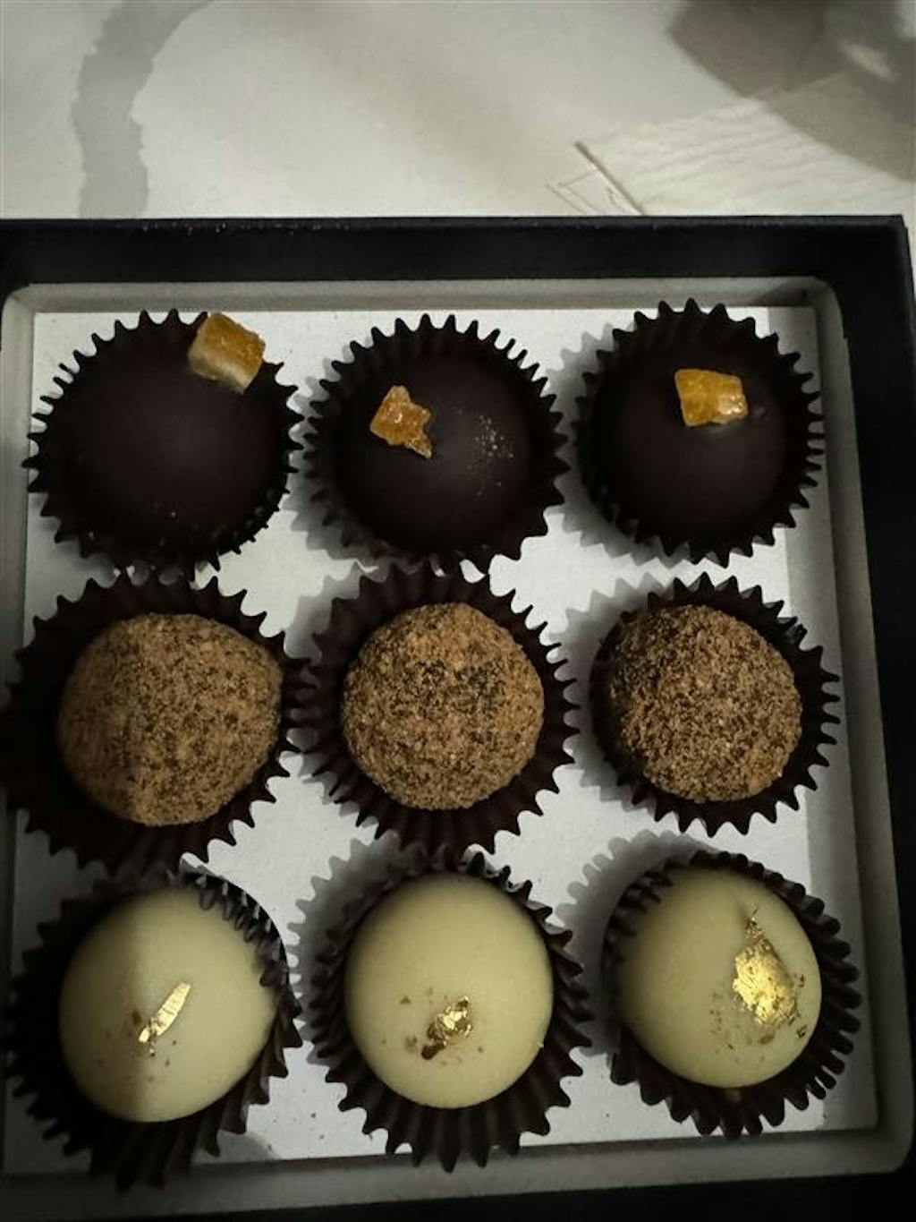 • Nine Vosges Dalmore chocolate truffles topped with spiced ginger crumble, gold leaf and candied orange peel sit in a open, black candy box adorned in silver foil tied with a black ribbon bow on a white background.